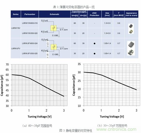 薄膜可變電容器的產品陣容如表1所示。1.3×0.9mm尺寸的LXRW19V系列、1.95×1.4mm尺寸的LXRWJFV系列已經產品化。