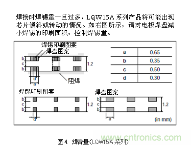 例如,LQW15A系列為獲得最適當的焊錫量,本公司提供了焊錫厚度和焊盤尺寸對應的推薦焊錫量。(圖4)