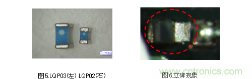 例如,元件單側未與焊錫接觸而引發豎起的立碑現象(曼哈頓現象),也稱為封裝不良情況。(圖6)