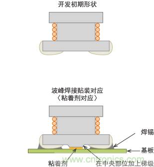 在 生產(chǎn)第一代LQN5N及第二代LQH32M時(shí),雖會(huì)對部分混合IC基板進(jìn)行回流焊接,但一般是對裝有插腳零部件的基板背面進(jìn)行波峰焊接。其貼裝方法是將膠 粘劑涂在基板焊盤的中央部或貼片元件電極的中央部,待其固化后將其投入波峰焊接槽。與CR貼片元件相比,體積較大的LQH系列在受到焊錫流動(dòng)阻力后易發(fā)生 脫落,因此在電極間中央部位設(shè)計(jì)了突起(稱為梯級磁芯)。現(xiàn)在看來的話,是反向支架形狀。至今再也見不到這種結(jié)構(gòu)。