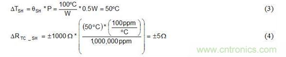 公式 3 可計算功率耗散所引起的電阻器溫度增加量 ΔTSH。公式 4 將 ΔTSH 插入公式 1 替代 ΔT,以確定 100°C/W 適度自發熱和 0.5W 功率耗散情況下自發熱所引起的電阻變化。