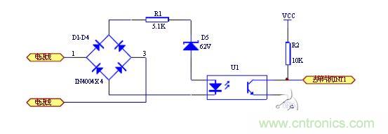 當(dāng)沒有振鈴信號時,線路上的供電電壓為48V(部分交換機(jī)為60V),經(jīng)四個二極管構(gòu)成的全橋整流后,不足以使62V穩(wěn)壓管導(dǎo)通,振鈴信號輸出端電壓接近0V,當(dāng)振鈴信號到來時,線路上的90V交流振鈴信號經(jīng)全橋整流變換后90V的脈動直流電,其峰值足以擊穿耐壓值為62V穩(wěn)壓管,經(jīng)電阻R1給U1提供電壓,從光電耦合器輸出的波形是 時通時斷的方波方波信號,可以直接輸出至單片機(jī)的中斷輸入口, CPU可以根據(jù)振鈴信號光電轉(zhuǎn)換后的高低電平檢測有無振鈴。