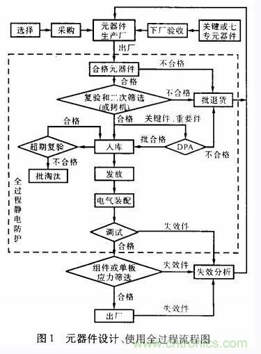 元器件使用全過程包括選擇、采購、監制、驗收、篩選(拷機)、破壞性物理分析(DPA)、保管、使用、電氣裝配、通電調試、靜電防護和失效分析等。元器件的選擇和使用全過程流程圖如圖1所示。
