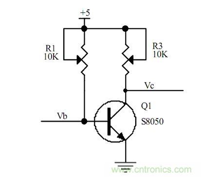 2、當(dāng)我們調(diào)節(jié)可調(diào)電阻,R1,使R1=4.3K時(shí),通過(guò)歐姆定律我們可以計(jì)算得到,Ib=(5-0.7)/4.3K=1mA,那我們就可以計(jì)算出IC=Hfe*Ib=10mA,假如這個(gè)時(shí)候我調(diào)節(jié)R3,使R3=1K歐姆,通過(guò)計(jì)算我們可以得到Vc=5-(10mA*1K)=-5V,回出現(xiàn)-5V嗎,當(dāng)然不會(huì),因?yàn)闆](méi)有負(fù)壓,所以Vc的電壓會(huì)停留在0V,那這個(gè)時(shí)候我們?cè)賮?lái)看下Ic到底是多少?