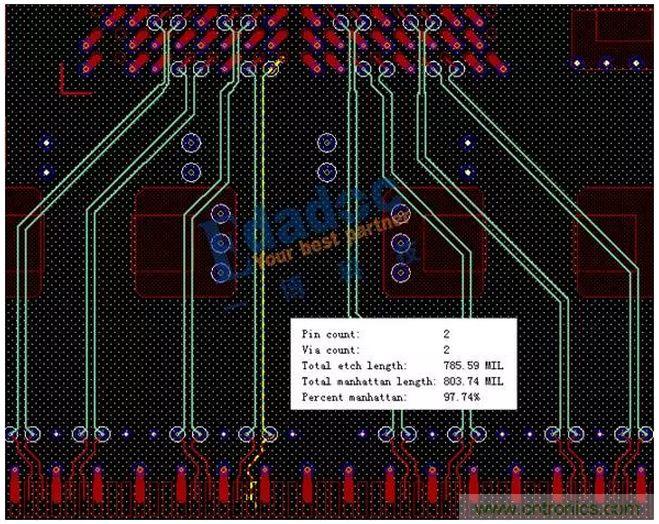 連接器采用的是CFP2的表貼連接器,由于PHY芯片到光口連接器距離很短,所以當(dāng)初設(shè)計(jì)的時候就直接從芯片打孔連線過來,沒有經(jīng)過任何特殊的處理,最后板上走線總長度約800mil,如下圖一所示。