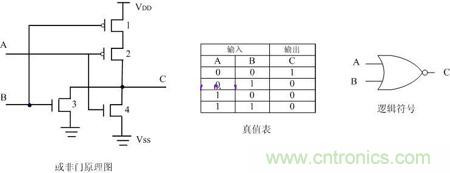 將上述“與非”門、“或非”門邏輯符號的輸出端的小圓圈去掉,就成了“與”門、“或”門的邏輯符號。而實現(xiàn)“與”、“或”功能的電路圖則必須在輸出端加上一個反向器,即加上一對CMOS管,因此,“與”門實際上比“與非”門復(fù)雜,延遲時間也長些,這一點在電路設(shè)計中要注意。