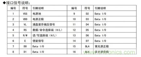 我們首先來看1602的引腳定義,1602的引腳是很整齊的SIP單列直插封裝,所以器件手冊只給出了引腳的功能數(shù)據(jù)表: