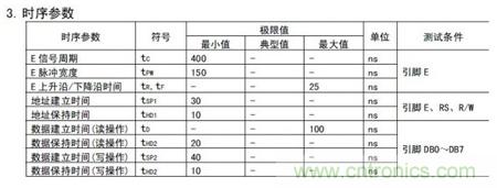 也許你還注意到了上面有許多關(guān)于時間的標(biāo)注,這也是個十分重要的信息,這些時間的標(biāo)注表明了某些狀態(tài)所要維持的最短或最長時間。因為器件的工作速度也是有限的,一般都跟不上主控芯片的速度,所以它們直接之間要有時序配合。話說現(xiàn)在各種處理器的主頻也是瘋狂增長,日后搞不好出現(xiàn)個雙核單片機(jī)也不一定就是夢話。下面是時序參數(shù)表: