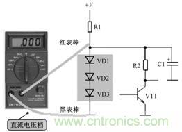 檢測這一電路中的3只二極管最為有效的方法是測量二極管上的直流電壓,如圖9-41所示是測量時接線示意圖。如果測量直流電壓結果是1.8V左右,說明3只二極管工作正常;如果測量直流電壓結果是0V,要測量直流工作電壓+V是否正常和電阻R1是否開路,與3只二極管無關,因為3只二極管同時擊穿的可能性較小;如果測量直流電壓結果大于1.8V,檢查3只二極管中有一只開路故障。