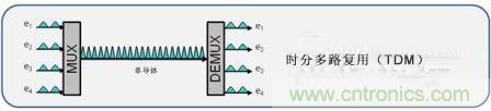 時分復用是一種通過使用越來越小的時間增量來傳輸更多的數據的方式,并且將較低數據率的信號復用進較高速度的復合信號中。通過時分復用,較低速度的電信號交錯在時間中,并在較快的復合光路上傳輸。因此,所得的較高數據速率將是單個輸入速率的數倍。
