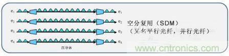 空分復用,通常被稱為并行光纖,是一種通過在復合鏈路中增加一條或多條光纖來增加一個或多個通道的方式。在這種情況下,一個通道實際上就是另一股光纖。這是上述時分復用通道的一個替代方案,在時分復用中,信號以按時間合并在同一條光纖上。行業中有很多應用這種技術的例子。例如,40G SR4通過使用四通道或光纖,在多模光纖上提供40Gbps的速率。也就是在每個方向上有四個通道。這也正是“SR4”中4的含義,4個通道,每個10Gbps。