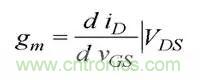 在轉移特性曲線上,gm 是曲線在某點上的斜率,也可由iD的表達式求導得出,單位為 S 或 mS。