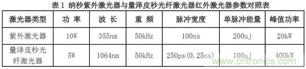 皮秒光纖激光器是在超快激光基礎(chǔ)上開發(fā)出的新一代激光器,尤其是近年來光纖器的研制成功,標志著激光技術(shù)的一次飛躍進步,與固體納秒激光相比,皮秒光纖激光器具有以下優(yōu)點:1.激光脈沖寬度更窄,僅為 10^-12S,從上述材料吸收激光能量轉(zhuǎn)化為熱能的擴散距離公式可知,這將大大減小激光加工材料時的熱擴散距離,降低激光對材料的熱損傷;2.因脈沖寬度變窄,激光單脈沖峰值功率成倍增加,提升了激光加工材料的能力;3.光纖激光器以細小的光纖作為激光的傳輸和放大介質(zhì),與固體放大結(jié)構(gòu)相比,不僅工作穩(wěn)定,免除了周期性的調(diào)校工作,降低了維護成本,而且結(jié)構(gòu)小巧,制造成本相對較低。表1是量澤激光公司研制的光纖器與目前市面上主流的納秒級固體紫外激光器的參數(shù)對照: