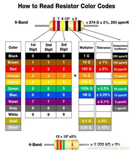 電阻器的阻值、形狀及物理尺寸多有不同。實際上,所有功率額定達到一瓦特的引線電阻器均有特定的色環組合,用以表示其電阻值、容差乃至溫度系數。電阻器通體可能會遍布三到六個色環,其中以四色環最為常見。前幾個色環代表電阻值的有效數位。接下來是一個倍率色環,用來左移或右移小數點的位置。最后方的色環代表容差以及溫度系數。