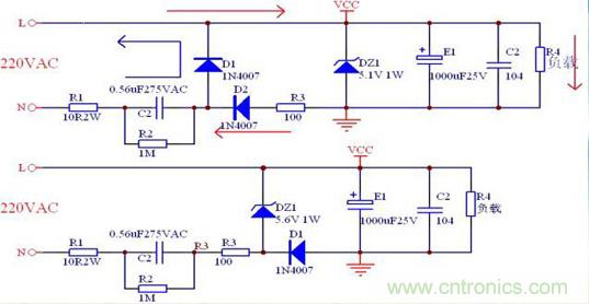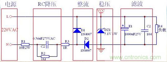 此處與線性變壓器電源的區別:阻容降壓電源是通過負載電流選定電容;線性變壓器電源是通過負載電壓和功率選定變壓器。