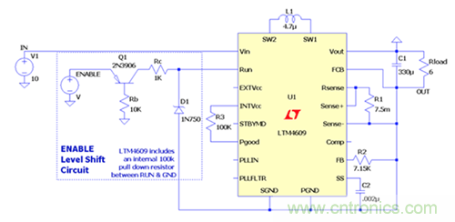 圖3中的簡單電路采用基于PGND的使能信號,電平將其降低到適合RUN引腳的電壓電平。在使能信號為高電平的電路中,PNP晶體管Q1導通,產生一個具有Rb,Rc的偏置電流,使RUN引腳電壓高于其閾值,并開啟μModule穩壓器。D1引腳的最大電壓被鉗位,以防止超過引腳的絕對值。最大額定值。當使能信號為低電平時,Q1關閉,電阻R3將RUN引腳放電至閾值以下,以關閉μModule穩壓器。注意μModule穩壓器封裝內部可能已包含電阻R3和/或齊納二極管D1,詳情請參閱數據表。