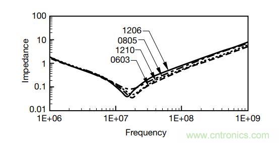 一般來說,直插件的引線較長,其寄生電感比SMD大;電解電容內部有大量卷繞結構的鋁箔,寄生電感比其它工藝的電容大。1206尺寸的MLCC內部電極面積和焊接端子截面明顯比0805大,所以尺寸越大的MLCC,自諧振頻率就越低。
