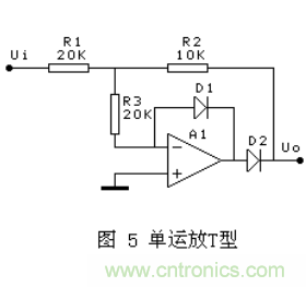 圖5 和 圖6 要求R1=2R2=2R3,增益為1/2,缺點是:當輸入信號正半周時,輸出阻抗比較高,可以在輸出增加增益為2的同相放大器隔離.另外一個缺點是正半周和負半周的輸入阻抗不相等,要求輸入信號的內阻忽略不計。