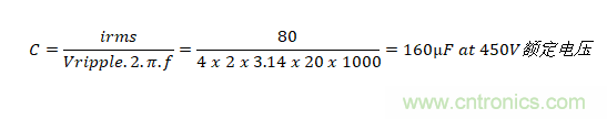 如果僅需要電容器來(lái)控制電動(dòng)汽車動(dòng)力系統(tǒng)等直流線路上的紋波電壓,則在選擇電容器時(shí)將會(huì)呈現(xiàn)顯著不同。 總線電壓可能與以前一樣為400V,但由采用電池供電,因此不存在穿越需求。在下游轉(zhuǎn)換器以20kHz的開(kāi)關(guān)頻率提取80Arms脈沖電流時(shí),將紋波限制在4Vrms以內(nèi)是非常現(xiàn)實(shí)的, 所需的電容是: