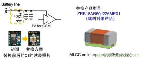 對連接在電池電路的GSM用PA電源線的Ta電容器的替換評估。