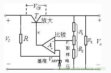 VI是整流濾波后的電壓,T為調整管,A為比較放大電路,VREF為基準電壓,它由穩壓管Dz與限流電阻R構成。R1與R2組成反饋網絡,是用來反映輸出電壓變化的取樣環節。