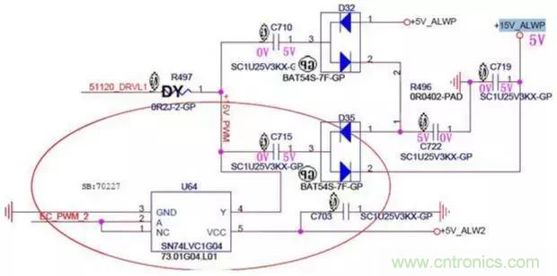 1.由于電容兩端的電壓不能突變,此時C715兩端的電壓為左邊5V,右邊為10V,然后電流經過D35的2引腳對C719電容充電,充完電后C719的電壓升到了10V。
