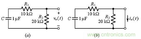 在圖5a的電路中,由vn表示的節點和地之間的阻抗為Z(s)=R||(1/sC)=R/(1+sRC),因此在s=-1/(RC)=-1/(1ms)時電路具有一個極點。假設vn(0)=1V,我們可以得到: