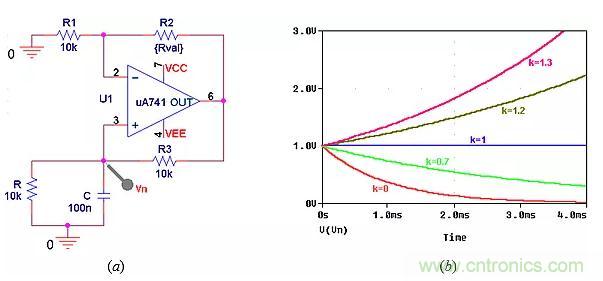 ● 將k提高到2以上,使運算放大器注入的能量超過端口電阻可以消耗的能量,引起發散振蕩,如圖9b中k=2.1所示。振蕩將持續增長到運算放大器飽和為止。