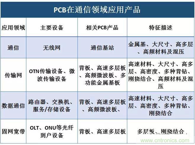 在通信領(lǐng)域的應(yīng)用占比由2009年的22%提升至2017年的27%,PCB在通信領(lǐng)域的應(yīng)用呈穩(wěn)步上升趨勢,主要運(yùn)用于手機(jī)、光模塊、濾波器、通訊背板、通訊基站天線等設(shè)備中;
