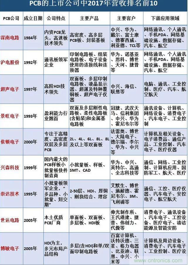 深南電路:成立于1984年,內(nèi)資PCB龍頭。擁有印制電路板、封裝基板及電子裝聯(lián)三項(xiàng)業(yè)務(wù)。公司在高密度、高多層PCB板產(chǎn)品方面具有顯著優(yōu)勢,可實(shí)現(xiàn)最高100層、厚徑比30:1等產(chǎn)品。下游通信領(lǐng)域營收占比突出,2017年?duì)I收占比超60%。