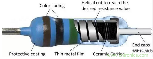 碳膜電阻主要是在陶瓷棒上形成一層碳混合物膜,例如直接涂一層,碳膜的厚度和其中碳濃度可以控制電阻的大小;為了更加精確的控制電阻,可以在碳膜上加工出螺旋溝槽,螺旋越多電阻越大;最后加金屬引線,樹脂封裝成型。碳膜電阻的工藝更加復雜一點,可以做精密電阻,但由于碳質的原因,還是溫度特性不太好。