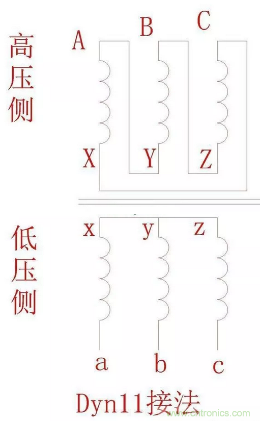 1.Dyn11的意義:D:高壓側(cè)三角形接法,y:低壓側(cè)星型接法;n:低壓側(cè)中性點引出;11:高低壓差相位差30度。