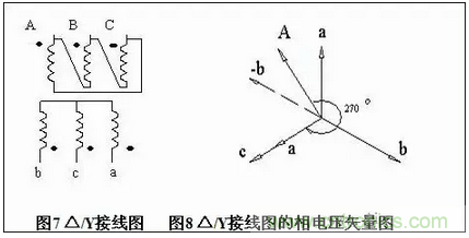 如圖7所示,識別圖中△/Y的接線圖它屬于幾組,根據(jù)上面的方法,畫出次邊a、b、c三相相電壓矢量圖,從接線圖中可以看出原邊A相繞組的頭連接B相繞組的尾作為原邊A相引出線,因此我們把原邊相電壓矢量A畫到次邊矢量a和-b中間,而次邊C相繞組的頭作為次邊a相輸出,因此我們把次邊矢量C當(dāng)成是矢量a調(diào)相來使用,然后以原邊A相順時旋轉(zhuǎn)到次邊a相,它們的夾角為270°,因此這個接線圖為 △/Y-9聯(lián)接組,見圖8。