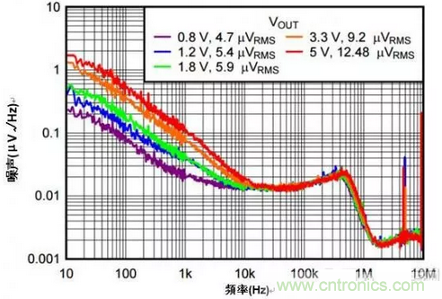 如您從各種曲線看到的那樣,輸出噪聲(以每平方根赫茲[μV/ Hz]來表示)集中在頻譜低端。該噪聲大部分出自內部參考電壓,以及誤差放大器FET和電阻分壓器。