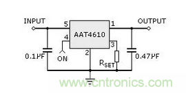 AAT4610的應用電路十分簡單,只要外接兩只濾波電容和一只電阻器RSET,便可實現過流保護功能,如圖3。