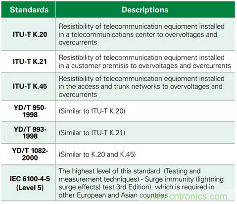 盡管客戶駐地設備(CPE)設計人員可采取三種基本的電路保護方案:氣體放電管(GDT)、瞬態電壓抑制(TVS)二極管陣列和保護型晶閘管,但他們所選擇的任何設備都必須使其設計最小程度地符合浪涌TIA-968B(以前稱為FCC第68部分)的要求。在美國,任何連接到公共交換電話網絡(PSTN)的通信設備均需具備此性能。其他國家也有類似要求,如表1所示。一些G.FAST供應商可能會傾向于在美國市場采用符合GR-1089-Core的安全設計。