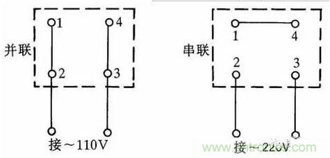 有的單相吹風(fēng)機引出4個接線端子,接線方法如圖5所示。采用并聯(lián)接法應(yīng)接入110V交流電源,采用串聯(lián)接法應(yīng)接入220V交流電源。