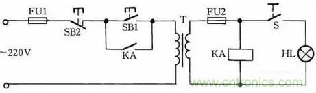 工作原理:閉合S后,按下按鈕SB1,變壓器得電輸出36V低電壓,使得繼電器或交流接觸器KA吸合。放松按鈕SB1后,KA自鎖觸點使KA保持吸合,繼續(xù)給變壓器接通電源。如果變壓器次級發(fā)生短路故障,繼電器線圈電壓為零,此時KA便失電釋放,將變壓器電源斷開,保護(hù)變壓器不被破壞。
