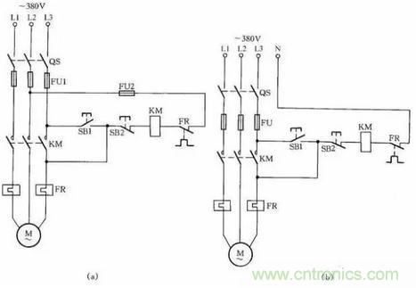 接觸器線圈電壓為380V時,可按圖12(a)所示接線;接觸器線圈電壓為220V時,可按圖12(b)接線。圖12(a)的接線還有缺陷,即在電動機停轉(zhuǎn)時,其引出線及電動機帶電,使維修不大安全。因此,這種線路只能在應(yīng)急時采用,并在維修電動機時,應(yīng)斷開控制電動機的總電源開關(guān)QS,這一點應(yīng)特別注意。