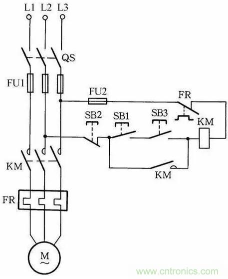 圖中SB2為停止按鈕,在停止時,按動SB2的時間要長一點。否則,手松開按鈕后,接觸器又吸合,使電動機繼續(xù)運行。這是因為電源電壓雖被切斷,但由于慣性的作用,電動機轉(zhuǎn)子仍然轉(zhuǎn)動,其定子繞組會產(chǎn)生感應(yīng)電動勢,一旦停止按鈕很快復(fù)位,感應(yīng)電動勢直接加在接觸器線圈上,使其再次吸合,電動機繼續(xù)運轉(zhuǎn)。