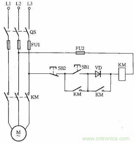 因為啟動電流較大,所以這種線路只適用于操作不頻繁的場合。線路中,VD應(yīng)選用耐壓大于700V的二極管,電流要根據(jù)交流接觸器線圈電流而定。
