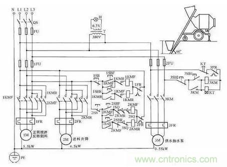 這時料斗已升到預(yù)定位置,把料自動倒到攪拌機內(nèi),并自動停止上升。此時操作人員按下下降按鈕2SBR時,卷揚系統(tǒng)帶動料斗下降,待下降到其料口與地面平齊時,擋鐵碰撞行程開關(guān)3SQ,使2KMR接觸器斷電釋放,自動停止下降,為下次上料做好準(zhǔn)備,這時攪拌機料已備好,操作人員再按下3SB1,3KM接觸器得電吸合,使供水抽水泵電動機3M運轉(zhuǎn),向攪拌機內(nèi)供水,與此同時,時間繼電器KT得電工作,待供水與原料成比例后(供水時間由KT時間繼電器調(diào)整確定,根據(jù)原料與水的配比確定),KT動作延時結(jié)束,從而使3KM自動釋放,供水停止。