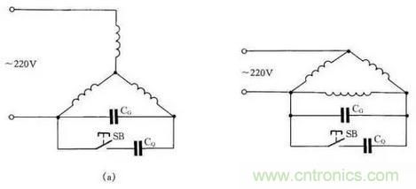 如圖19所示:圖(a)為Y形接法電動機連接方法,圖(b)為△形接法電動機連接方法。為了提高啟動轉(zhuǎn)矩,將啟動電容CQ在啟動時接入線路中,在啟動完畢后退出。