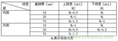 我們會以為導(dǎo)線的橫截面是一個矩形,但實際上卻是一個梯形。以TOP層為例,當(dāng)銅箔厚度為1OZ時,梯形的上底邊比下底邊短1MIL。比如線寬5MIL,那么其上底邊約4MIL,下底邊5MIL。上下底邊的差異和銅厚有關(guān),下表是不同情況下梯形上下底的關(guān)系。