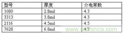 介電常數(shù):半固化片的介電常數(shù)與厚度有關(guān),下表為不同型號的半固化片厚度和介電常數(shù)參數(shù):