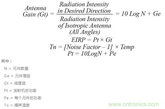 在設計時要考慮陣列大小與每個輻射元件的功率之間的權衡關系,這些元件會影響波束的方向性和有效輻射功率。可以通過考察一些常見的品質因數來預測天線的性能。通常,天線設計人員會考察天線增益、有效各向輻射功率 (EIRP) 及Gt/Tn。有一些基礎等式可用于描述以下等式中所示的這些參數。我們可以看到,天線增益和EIRP與陣列中元件的數量成正比。這可能導致地面雷達應用中常見的大型陣列。