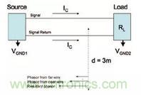 圖1:電路回路中的共模電流。電路中的源是一個數字信號(帶諧波),其負載被假定為阻性。因為遠端導線上的相電流和近端導線上的相電流的流向是相同的,所以其合成相量相較于差模電流產生的相量會更大。在這種情況下,為了限制輻射發射的水平,降低諧波成分的大?。p慢數字信號的上升/下降時間)或者轉移/限制共模電流是非常重要的。