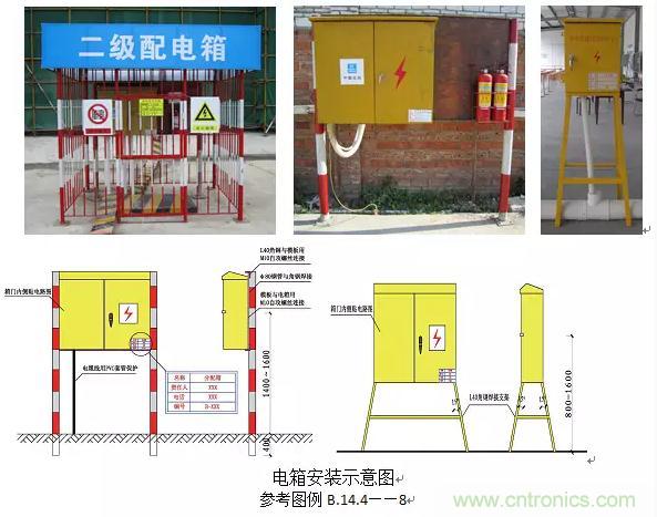 3、配電箱、開關(guān)箱應(yīng)裝設(shè)端正、牢固;固定式配電箱、開關(guān)箱的中心點(diǎn)與地面的垂直距離應(yīng)為1.4~1.6m;移動式配電箱、開關(guān)箱應(yīng)裝設(shè)在堅(jiān)固的支架上,其中心點(diǎn)與地面的垂直距離宜為0.8~1.6m。(JGJ46-2005第8.1.8條)
