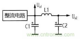 在圖 5 的電路中,整流電路輸出的單向脈動性直 流電壓先經電容 C1 濾波,去掉大部分交流成分,然后 再加到 L1 和 C2 濾波電路中。