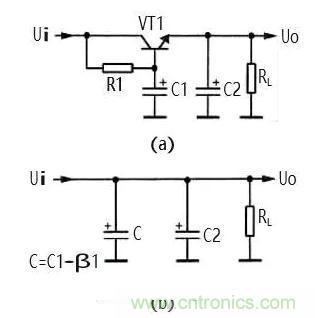 ①電路中的 VT1、 R1、 C1 組成電 子濾波器電路,這 一電路相當于一 只容量為 C1×β1 大小電容器,β1 為 VT1 的電流放 大倍數,而晶體管 的電流放大倍數 比較大,所以等效 電容量很大,可見 電子濾波器的濾 波性能是很好的。等效電路如圖 6(b)所示。圖中 C 為 等效電容。